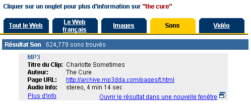 La page de résultats d'une recherche de sons présente les éléments :