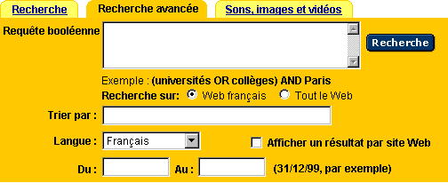La zone de Recherche Avancée d'AltaVista est constituée des éléments suivants :